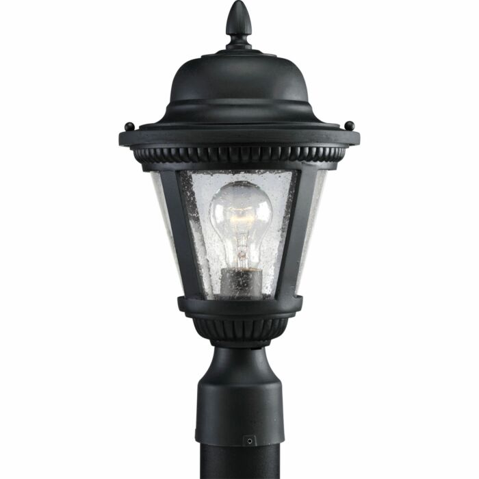 Add a touch of rustic appeal and classic styling with beaded detailing in the Westport collection. Clear seeded glass compliments the durable powder coat finish in die-cast aluminum frames. One-light 9" post lantern. Textured Black finish.