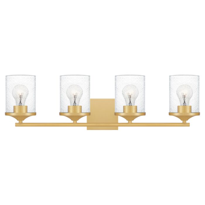 This 4-Light Bathroom Vanity Light from Quoizel is part of the Abner collection. It comes in a Aged Brass finish.- Measures 7.75" H x 28.00" W