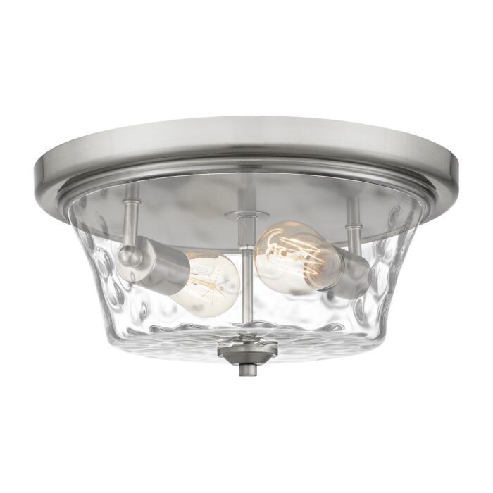 This 2-Light Flush Mount from Quoizel is part of the Acacia collection. It comes in a Brushed Nickel finish.- Measures 6.50" H x 14.00" L x 14.00" W