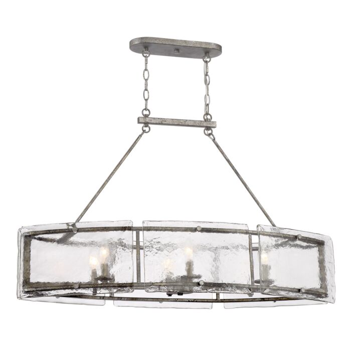 This 6-Light Island Chandelier from Quoizel is part of the Fortress collection. It comes in a Mottled Silver finish.- Measures 23.50" H x 15.50" L x 39.00" W