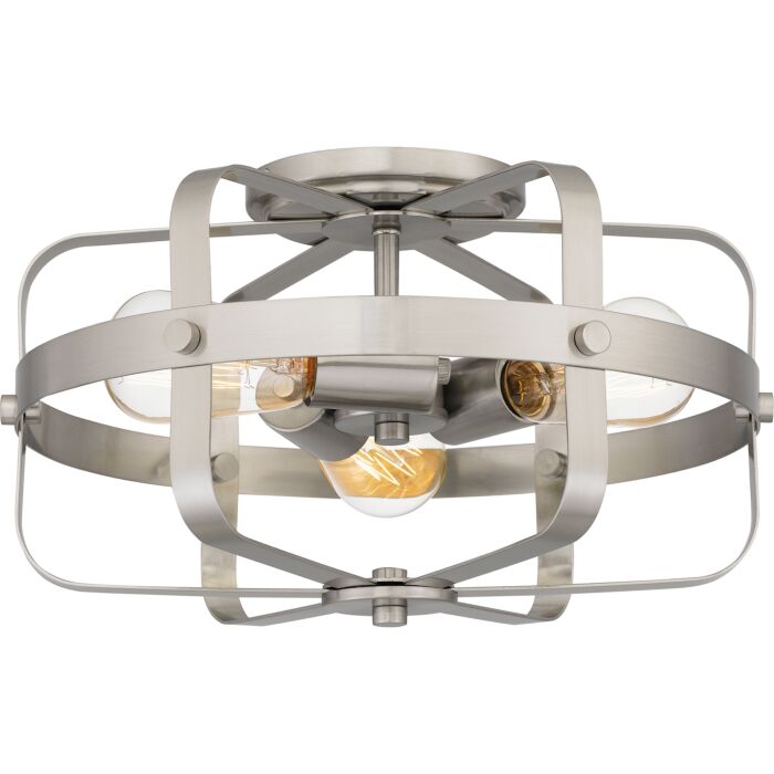 This Quoizel Flush Mount from Quoizel Lighting comes in a Brushed Nickel finish.Dry Rated. Can be used in dry environments like living rooms or bedrooms 7.75 H 14.00" W 14.00" L Bulb Type MED BASE A19 Bulb Qty 3 Base Finish BN - Brushed Nickel Item Weight 6.20 Product Specification Sheet