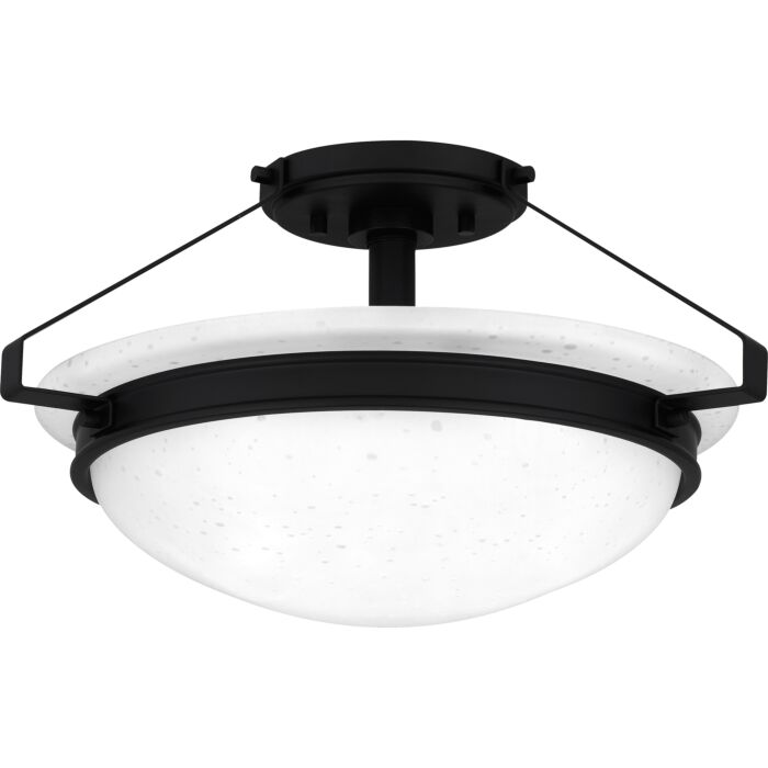 This Quoizel Semi-Flush Mount from Quoizel Lighting comes in a Matte Black finish.Dry Rated. Can be used in dry environments like living rooms or bedrooms 8.50 H 15.00" W 15.00" L Bulb Type MED BASE A19 Bulb Qty 2 Base Finish MBK - Matte Black Item Weight 6.50 Product Specification Sheet