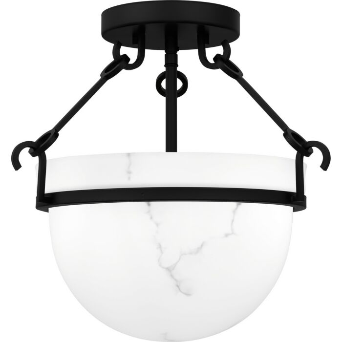 The Danyon semi-flush mount showcases understated sophistication in its transitional design, blending subtle refinement with a touch of refined elegance. A timeless silhouette crafted from a high-quality, non-reflective matte black finish pairs beautifully with an exquisite alabaster glass shade, resulting in a stunning visual harmony. This versatile lighting fixture is an ideal choice for a variety of settings, including hallways, foyers, home offices, living rooms, and bathrooms.
