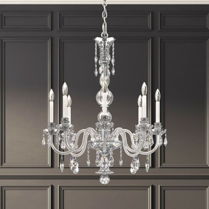 This Hamilton Nouveau 8-Light Chandelier in Silver is manufacturered by Schonbek- Measures 35"H x 28.00" L x 28.00" W