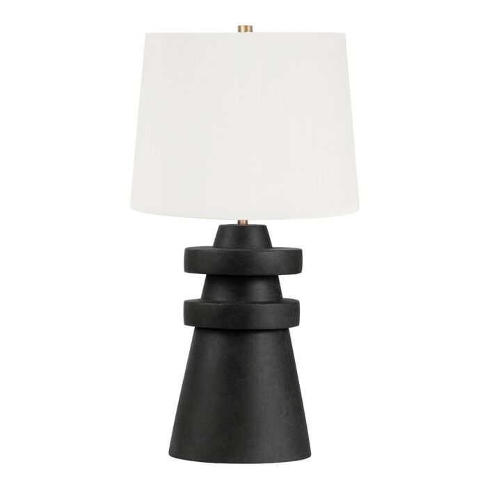 A distinctive conical base made from charcoal-coloured ceramic provides a handcrafted aesthetic that creates a striking sculptural presence, setting the tone for this unique table lamp. The ceramic rings surrounding the base contribute a dynamic visual element, achieving a harmonious balance that adds to the overall appeal. In contrast, the off-white linen drum shade brings a soft, textured element that beautifully complements the ceramic base, resulting in a beautiful, artistic, and contemporary table lamp design.