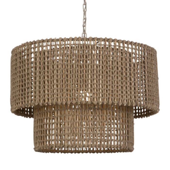 Natural Woven Jute Rope Makes Up The Two Tier Shade Construction Of This Breezy Pendant Accented With Antique Brass Adding A Dressed Up Feel To The Look. 1-100 Watt Max, Edison Socket. Bulb Not Included. Supplied With 15' Wire, 7' Chain For Adjustable Installation.