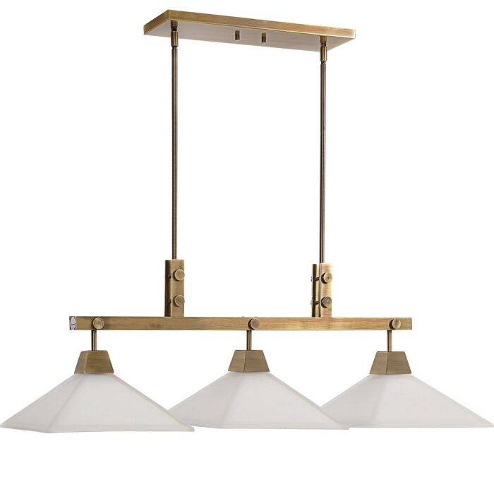 Enriched Industrial Style With A Hint Of Craftsman Lines Bring Together This Elegant Linear Chandelier Enhanced With An Aged Brass Finish And Etched, White Frosted Glass Shades. 3-100 Watt Max, Edison Sockets. Bulbs Not Included. Supplied With 20' Wire, 6-12" Stems And 2-6" Stems For Adjustable Installation.