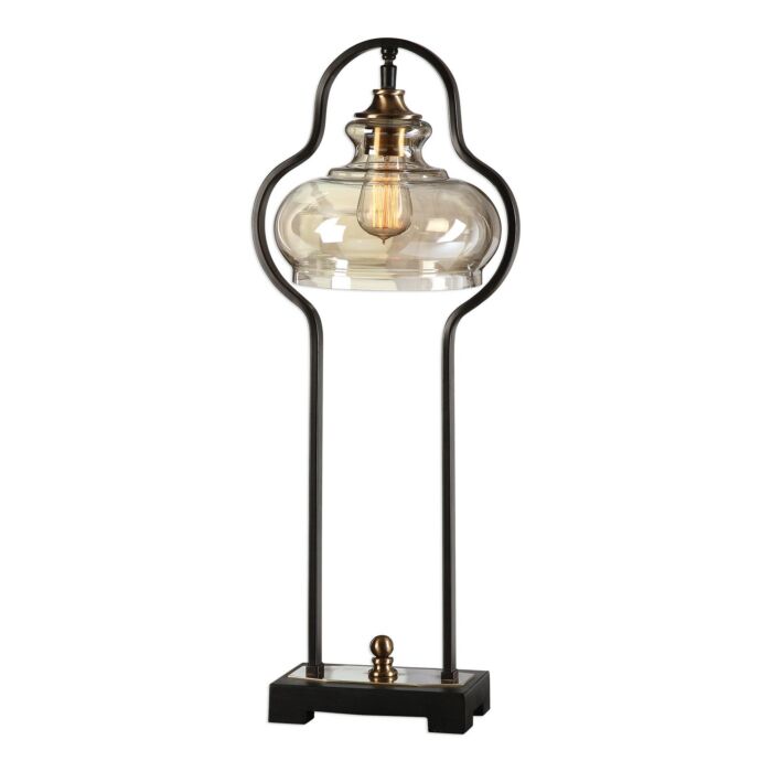 Curvaceous Forged Iron Finished In An Aged Black, Following The Contour Of The Light Amber Glass Shade, Accented With Brushed Antiqued Brass Plated Details. Pictured With An Antique Style Bulb, Not Included.