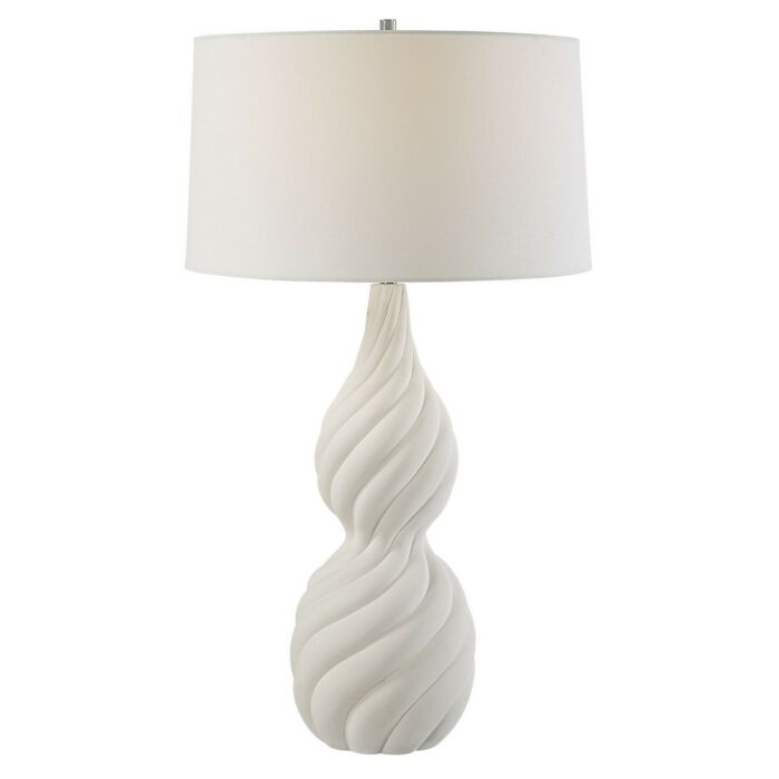 This Ceramic Table Lamp Features A 3-dimensional Twisted Swirl Pattern Finished In A Textured Chalk White Glaze Accented With Polished Nickel Details. The Tapered Round Shade Is Covered In A Crisp White Linen Fabric.