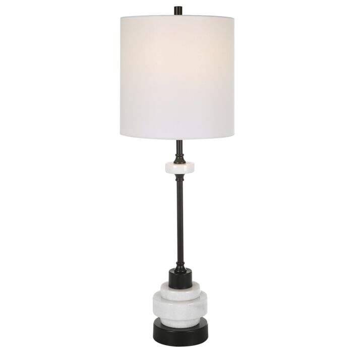 Inspired By Traditional Styling, The Alliance Buffet Lamp Is Crafted With Stacked White Marble Disk Accented With Satin Black Iron Details. Complemented By A Petite Drum Shade Covered In White Linen Fabric.- Uttermost's Lamps Combine Premium Quality Materials With Unique High-style Design.