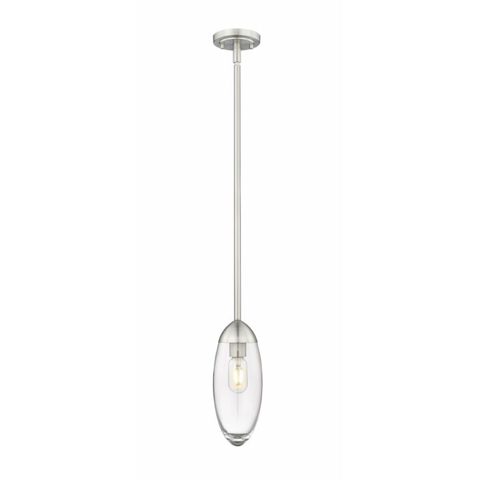 This 1-Light Pendant in Brushed Nickel comes from Z-Lite and is a part of the Arden collection.It measures 12" high x 4" wide. This light uses 1 Medium bulb(s). Dry rated. Can be used in dry environments like living rooms or bedrooms.