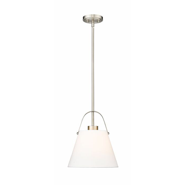 This 1-Light Pendant in Brushed Nickel comes from Z-Lite and is a part of the Z-Studio Linen Pendant collection.It measures 14" high x 12" wide. This light uses 1 Medium bulb(s). Dry rated. Can be used in dry environments like living rooms or bedrooms.